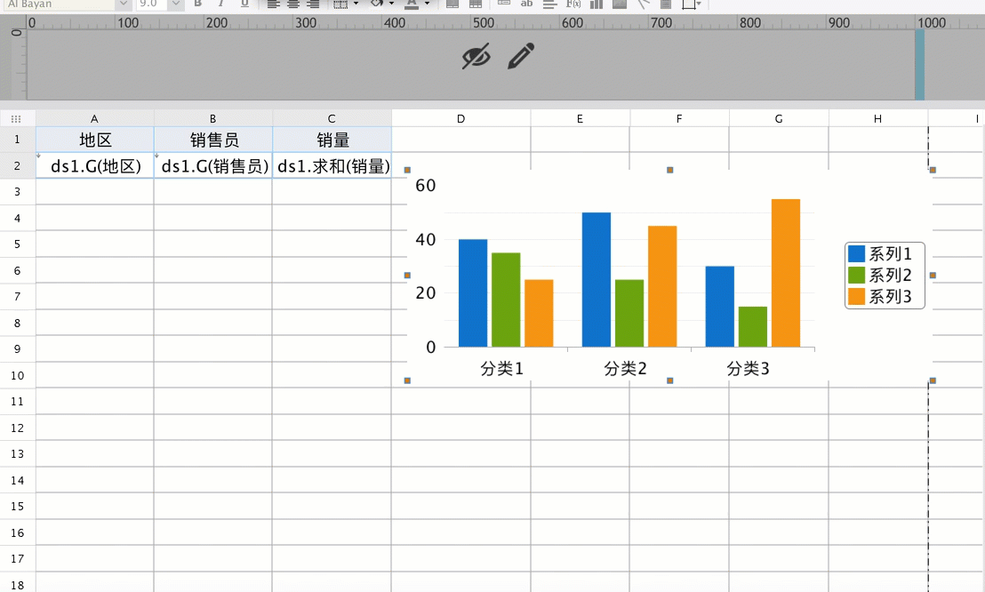 注:悬浮元素做出来的图表不同于上一节单元格图表能根据父格进行数据过滤,进行扩展从而根据地区显示对应的柱形图,悬浮元素没有父格概念一说,故,其不能通过设置父格来进行数据过滤,进行扩展,添加了几个悬浮元素图表,最后在web端查看的时候只会显示几个图表。另:导出Word格式文件,不支持导出悬浮元素图表