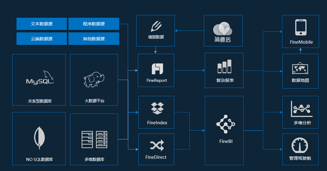 2)FineReport支持灵活定制各种中国式复杂报表;FineBI主要提供自助式的OLAP多维数据分析模式;