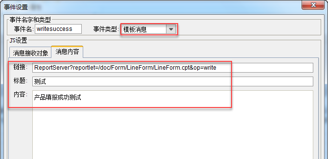 选择好消息接受对象后,填写消息内容,链接处填写ReportServer?reportlet=/doc/Form/LineForm/LineForm.cpt&op=write,表示模板消息发送后打开的模板,该模板以填报预览的方式打开,标题表示模板消息发送的标题,内容为消息提示内容,如下图所示:注:链接、标题、内容中都支持输入公式;链接不能为空。