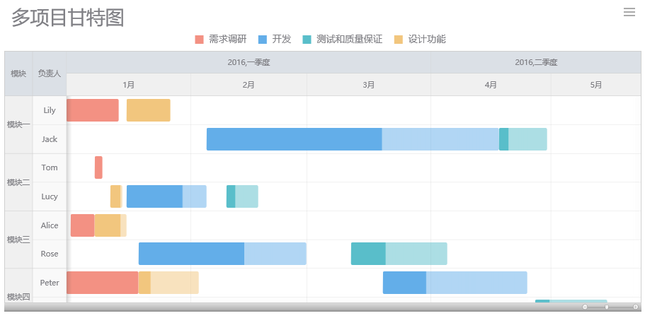 已完成模板,可参见:%FR_HOME%\WebReport\WEB-INF\reportlets\doc\Advanced\Chart\GanttChart\多项目甘特图.cpt