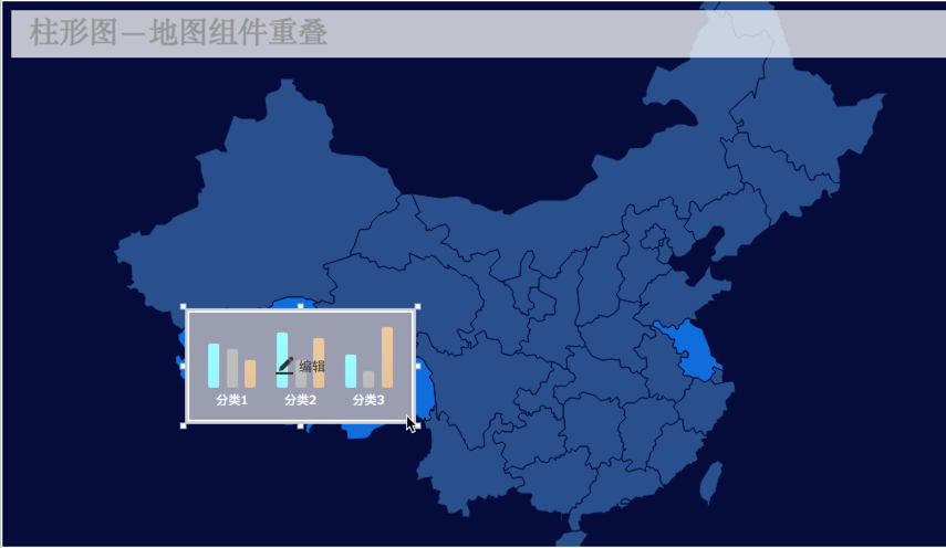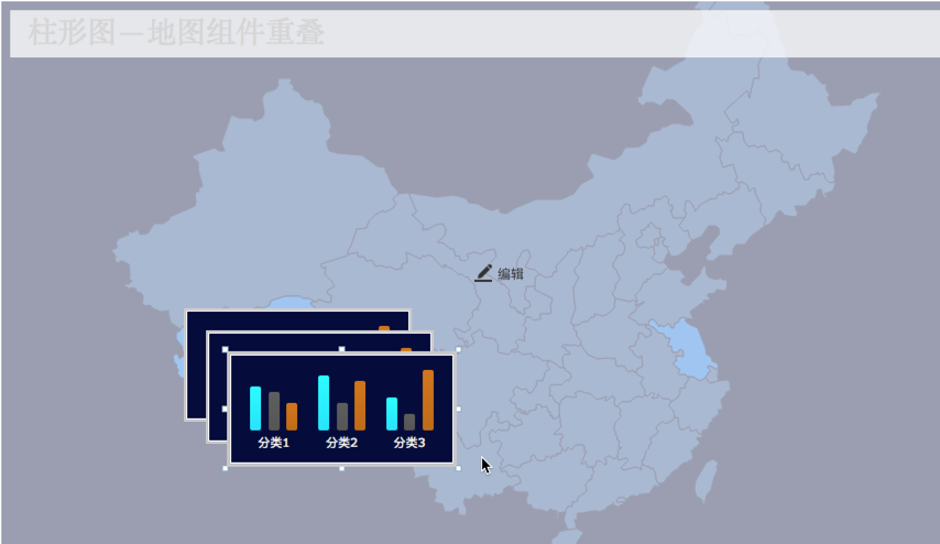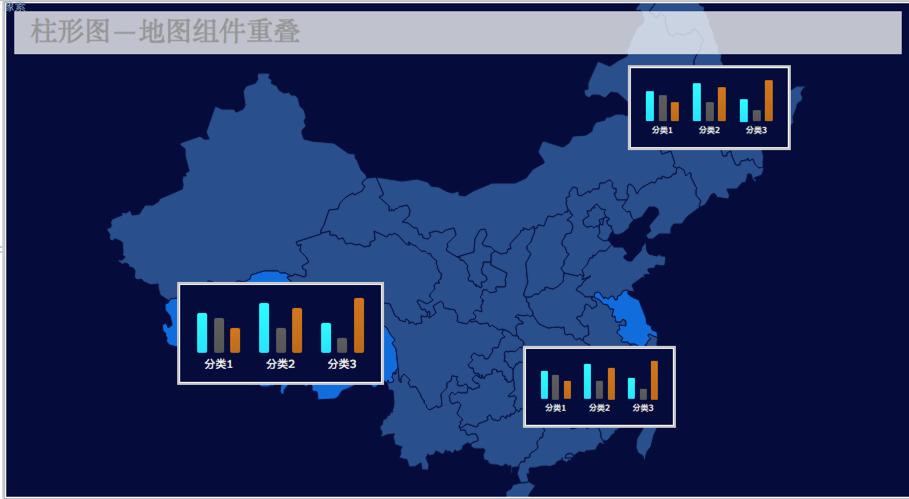 如下图所示:三个柱形图样式相同,只需修改数据配置以及大小,此时就可以利用复制功能;同时以地图为底层图层,将柱形图叠放于上,直观地展示区域数据。
