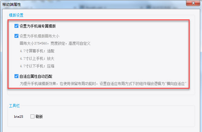 选择模板>移动端属性,将模板设置为手机端专属模板,则画布大小为375*560