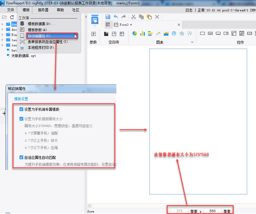 因此在制作手机端报表的时候需要优先考虑决策报表画布的大小,选择模板>移动端属性,勾选设置为手机端专属模板,画布大小默认设置为适配4.7寸屏幕的手机,如下所示: