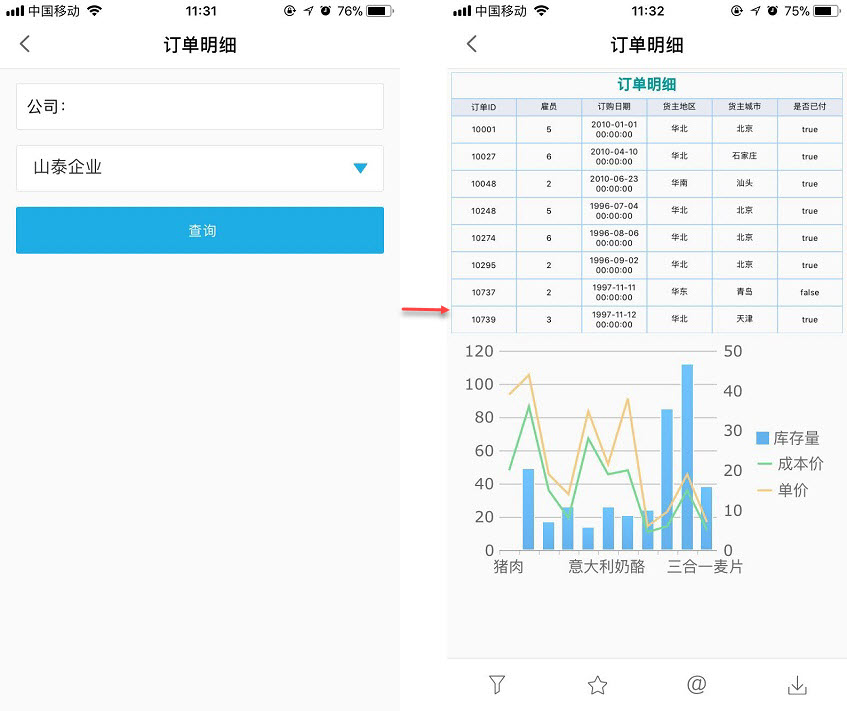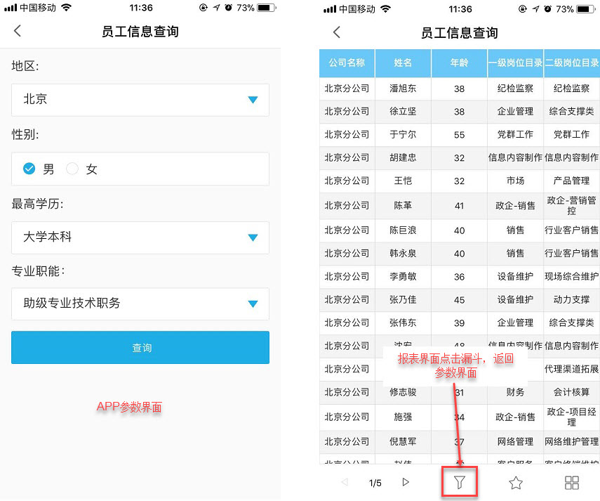与PC端不同,参数面板在移动端上展现时,会在报表页面显示前单独展示,在报表界面可以点击下方的漏斗图标返回参数界面重新选择参数。
