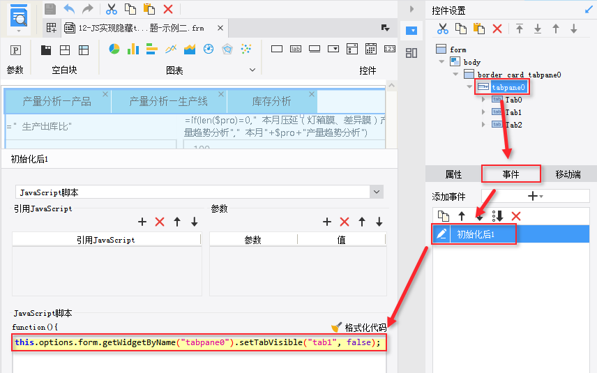 在决策报表右上角控件设置中,选择tabpane0控件,添加初始化事件,如下所示: