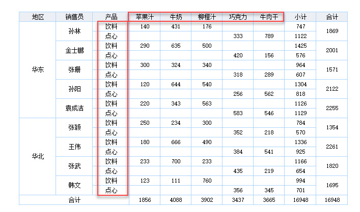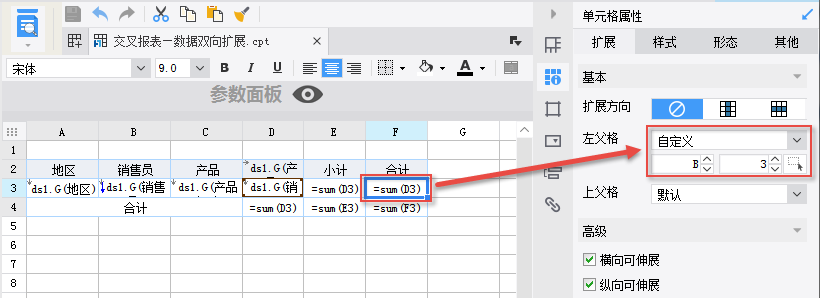 数据:根据父子格的概念,销量会以产品类型为左父格,产品为上父格,自动匹配出销售员与产品对应的销量。