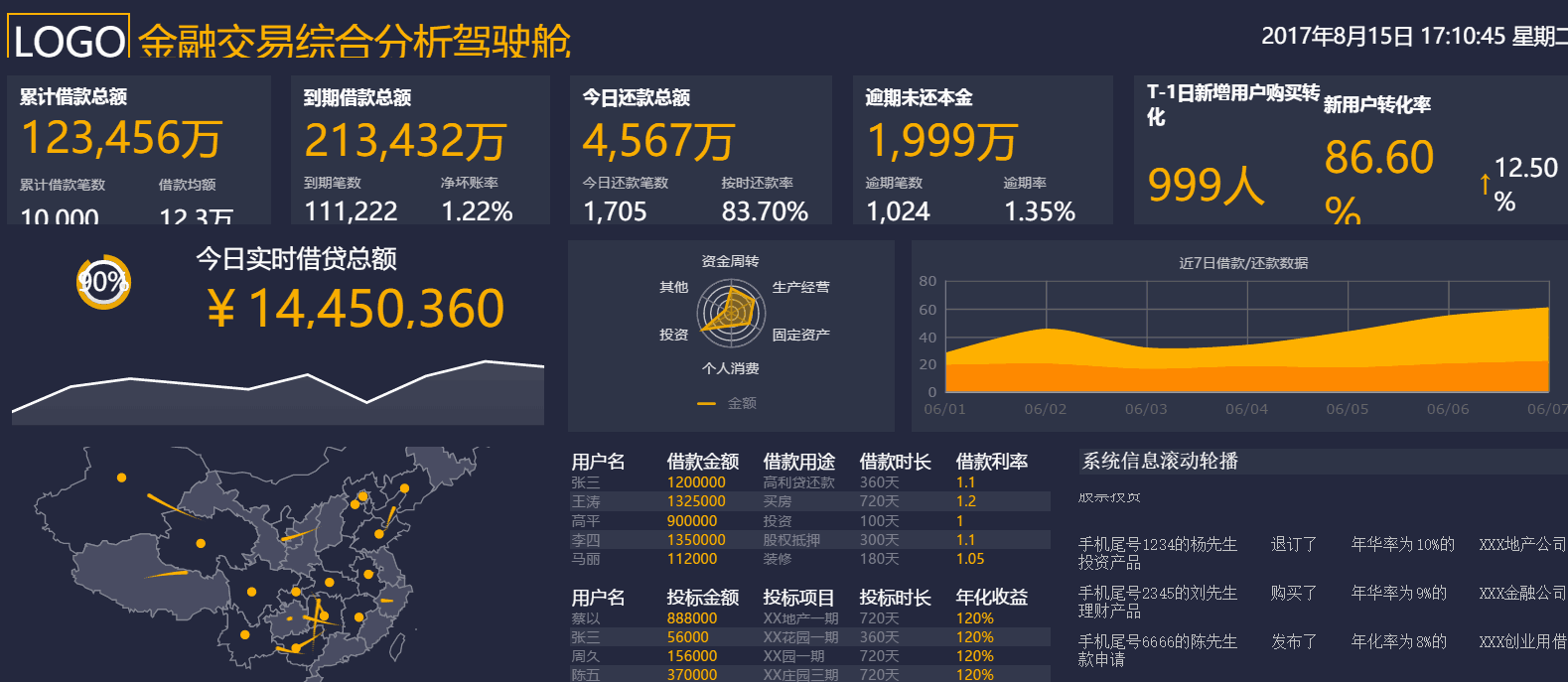 再比如这个销售驾驶舱,通过边框动画、地图流向动画,来增加大屏展示的整体活力。