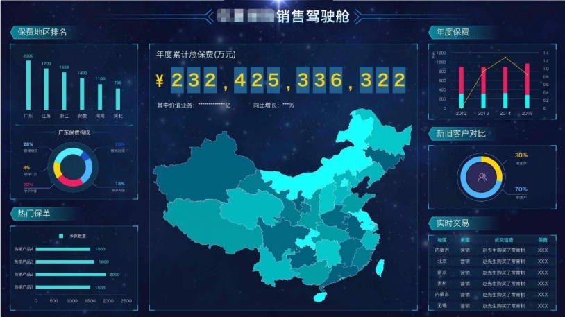 如下图所示销售驾驶舱大屏,顶部的标题通过左右两个对称线条进行点缀,各个组件的细分标题通过不规则渐变色图片进行点缀,另外每个组件都搭配使用了简洁的边框以提升层次感。