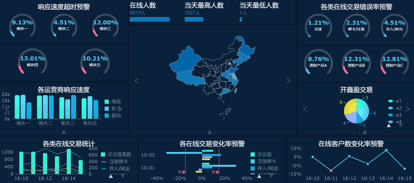 动效的增加能让大屏看上去是活的,增加观感体验。但过分的动效极其容易喧宾夺主,让观看者的眼球不知道往哪里聚焦,反而丧失了业务展现价值。这个度很难把握,既要平衡酷炫效果,又要突出内容。