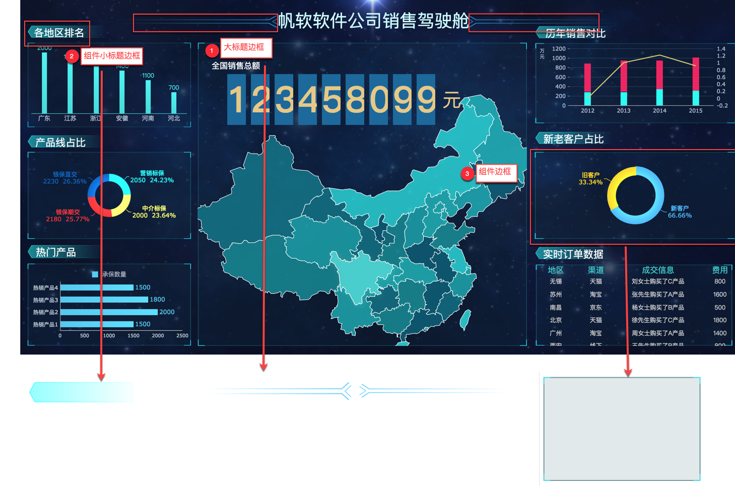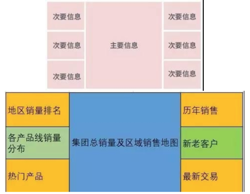 业务部门的需求,是要重点展现集团销售总额数据以及各地区的数据,其他次要内容包括历年销售对比、各产品线销售、热门产品、实时交易、新老客户占比等。我们从常见的几种主次分布排版样式里挑选了一种作为此次的版面,如下图所示: