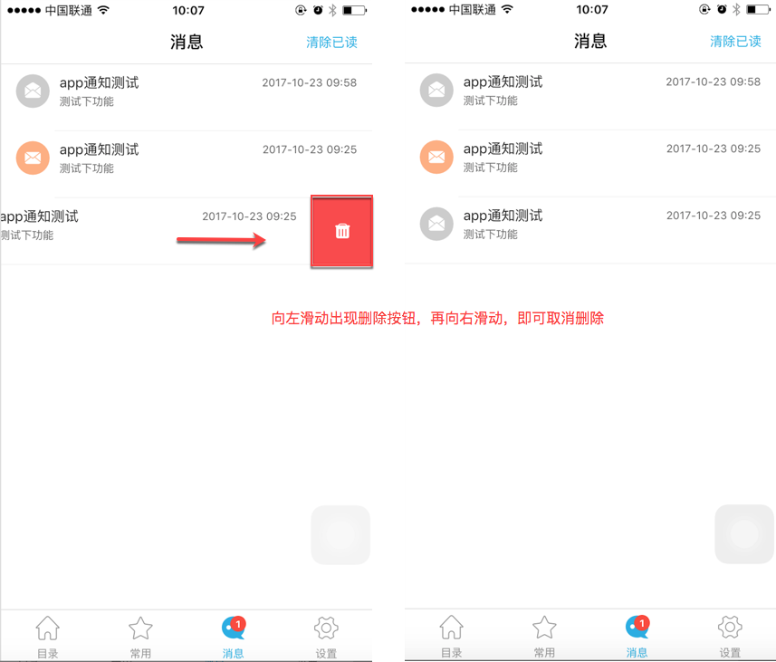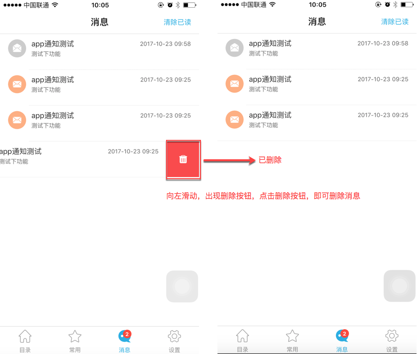 1)手指左滑,出现删除按钮,点击删除按钮,就可以删除消息,如下图: