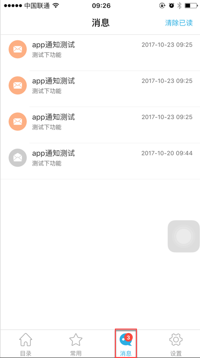 APP9.0中删除了状态栏中的未读消息提示及目录里的红点消息提示,收到的消息统一显示于消息列表界面中;