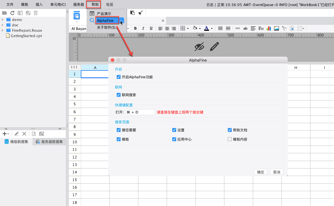 点击菜单栏帮助>AlphaFine,弹出AlphaFine设置界面,如下图: