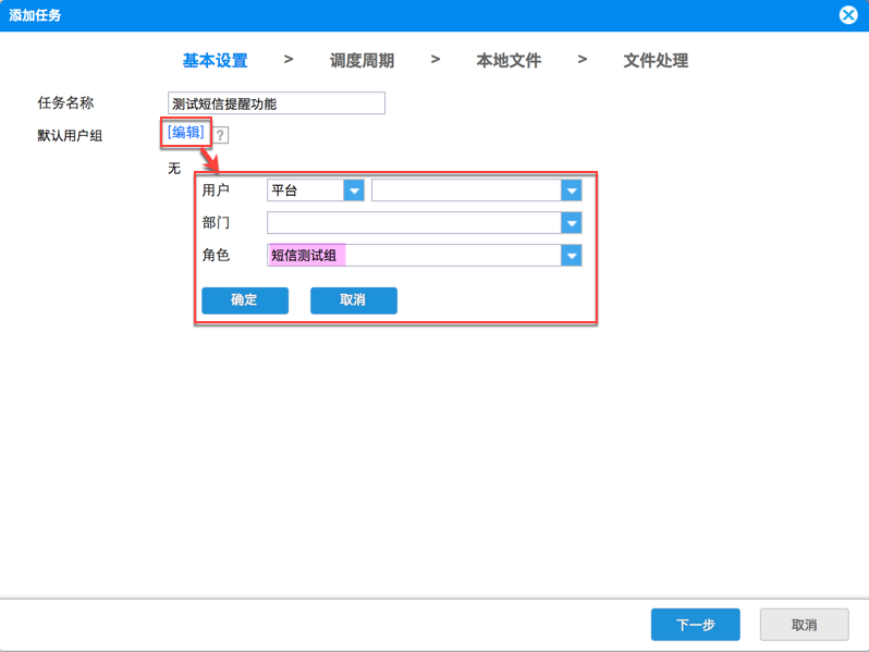 第一步——基本设置,填写任务名称,设置默认用户组,点击“编辑”,根据“角色”选择上面新增的短信测试组,点击确定,默认用户组设置完成,如下图: