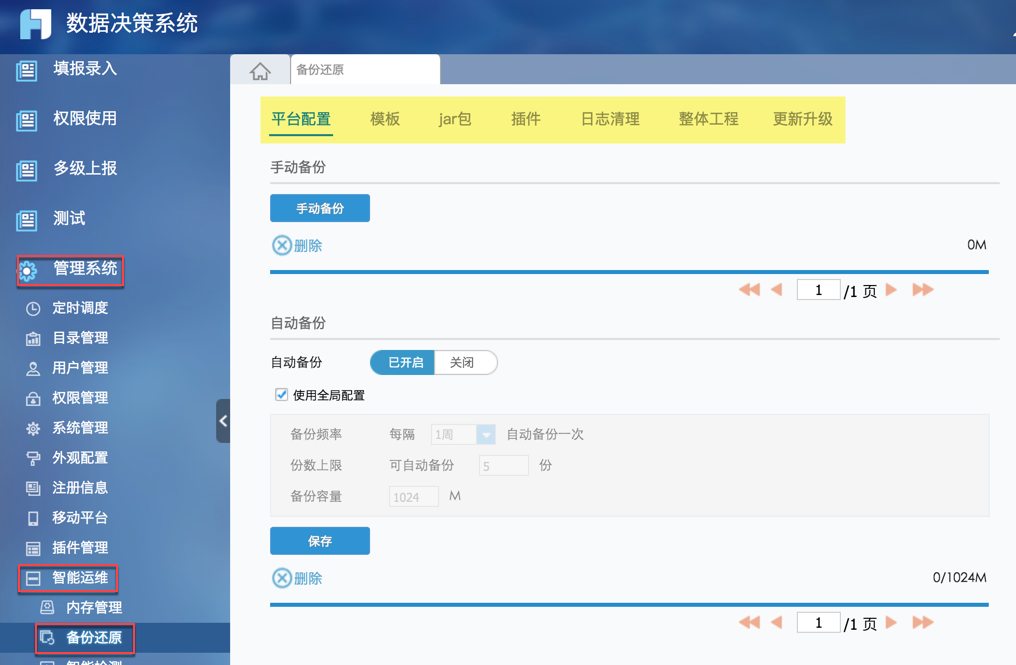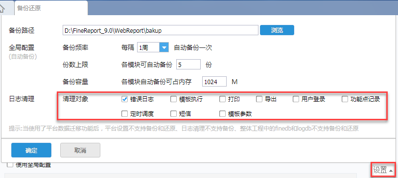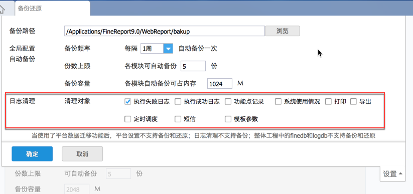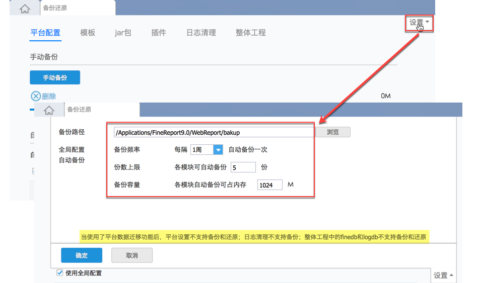 注:当使用了平台数据迁移功能后,平台设置不支持备份和还原;日志清理不支持备份;整体工程中的finedb和logdb不支持备份还原;