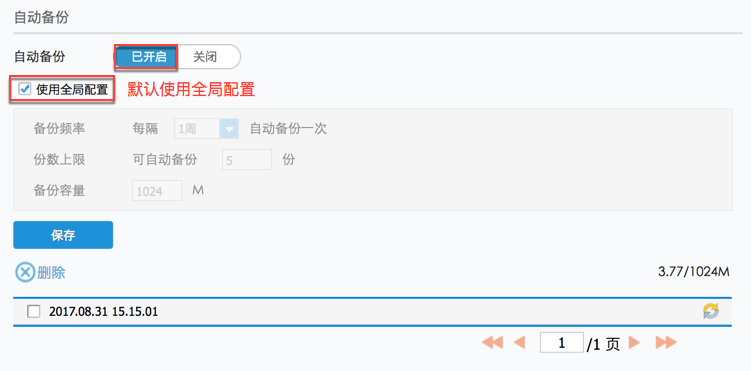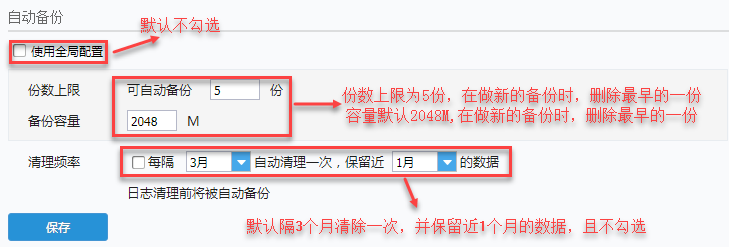 2)全局配置:指的是自动备份的情况下,对备份的频率,份数上限及备份容量的设置