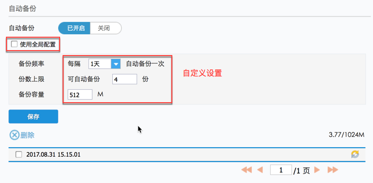 若不勾选“使用全局配置”,那么就可以自定义备份频率、份数上限、备份容量,如下图: