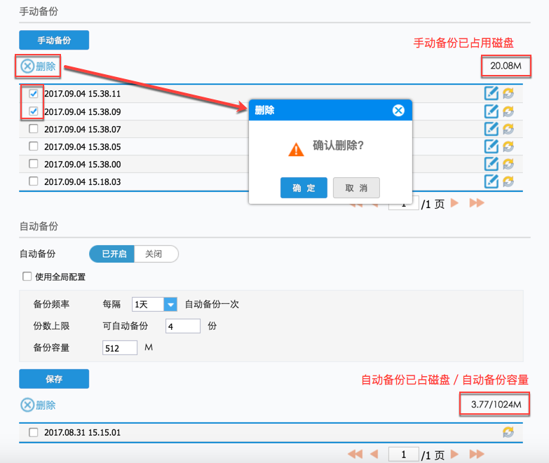 勾选需要删除的备份,点击删除,确认删除,即可删除之前的备份,自动备份和手动备份操作步骤一样,如下图: