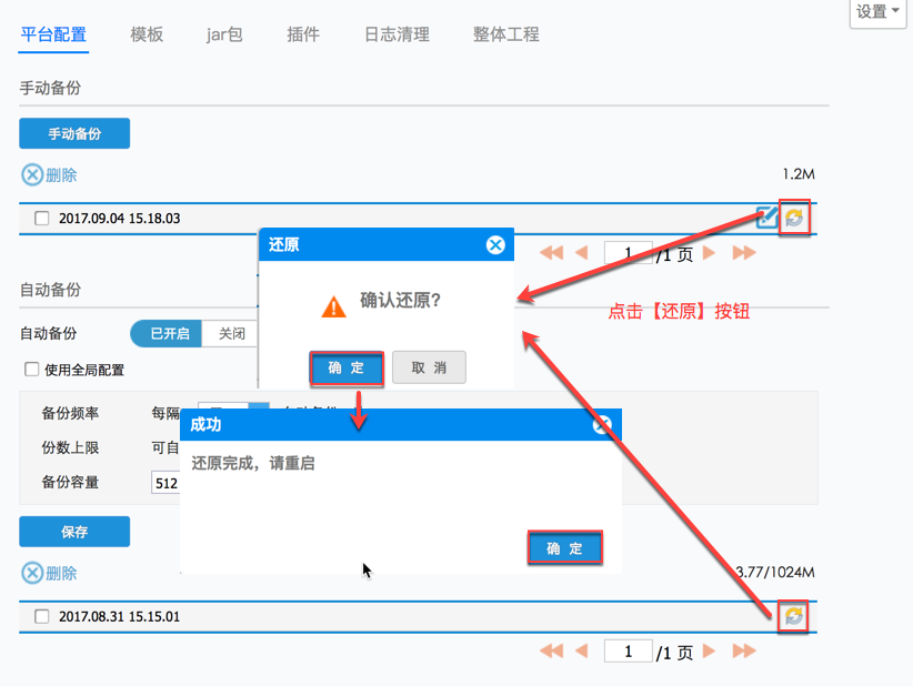 点击手动备份/自动备份下备份的文件,点击还原按钮,确认还原弹出“还原完成,请重启”,重启一下设计器即可生效,如下图: