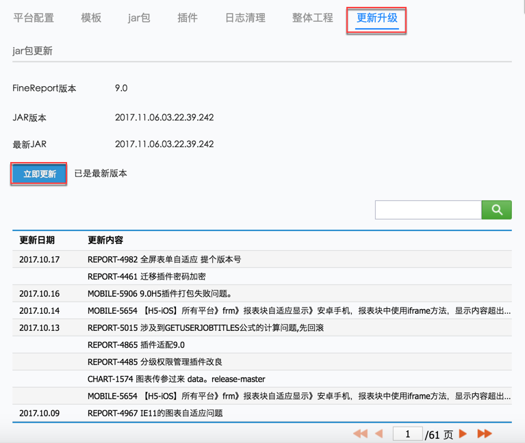 切换到更新升级标签页,点击【立即更新】,就可以对服务器工程进行更新升级(若已是最新版本则无法更新),如下图:
