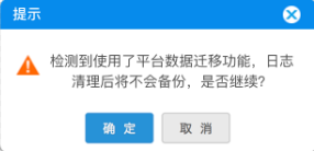 注:平台数据迁移后,将不支持logdb备份的功能。迁移后,不管之前清理频率是否勾选,都将checkbox置为不勾选。再次勾选时,若检测是平台数据迁移,给出confirm框提示“检测到使用了平台数据迁移功能,日志清理后将不会备份,是否继续”,确定,取消