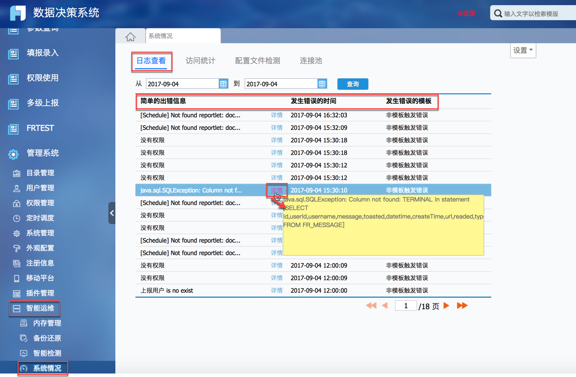 点击管理系统>智能运维->系统情况>日志查看,在日期控件中选择需要查看的日志日期之后,点击,即可看到所有该时间段内的日志信息,如下图:
