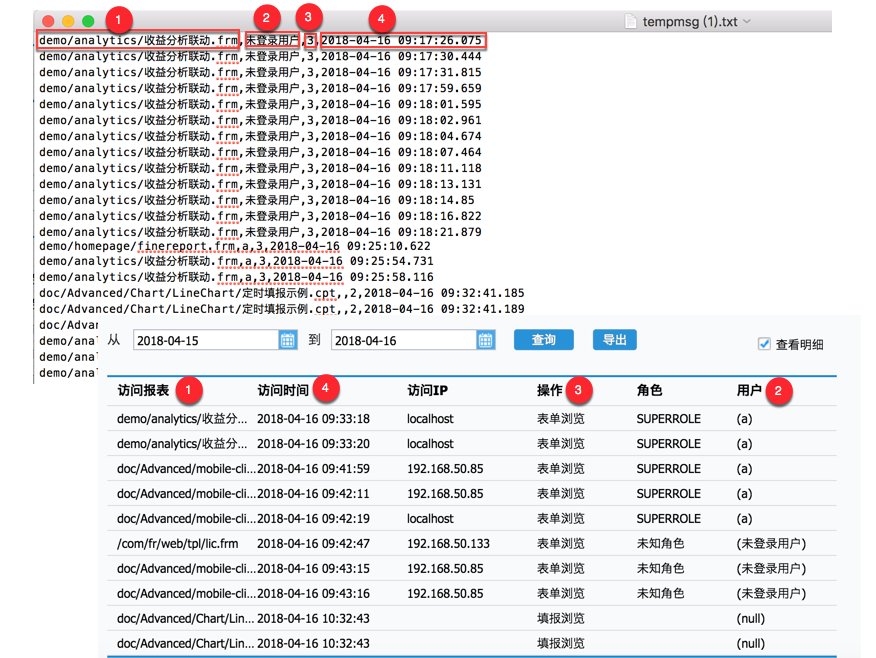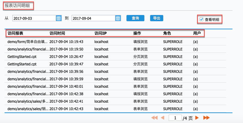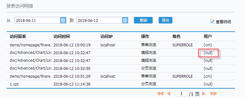 详细介绍哪个目录下面的报表被访问,访问时间,访问的ip,操作(什么方式访问的报表如:分页预览、填报预览、数据分析等),角色(登陆用户名的角色),用户名。