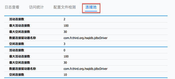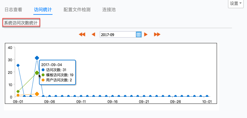 系统情况是对系统运行的各项情况进行监控分析,通过此功能可以查看到系统运行状态的各种指标,包括日志查看、访问统计、配置文件检测、连接池等。