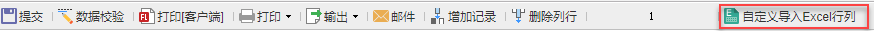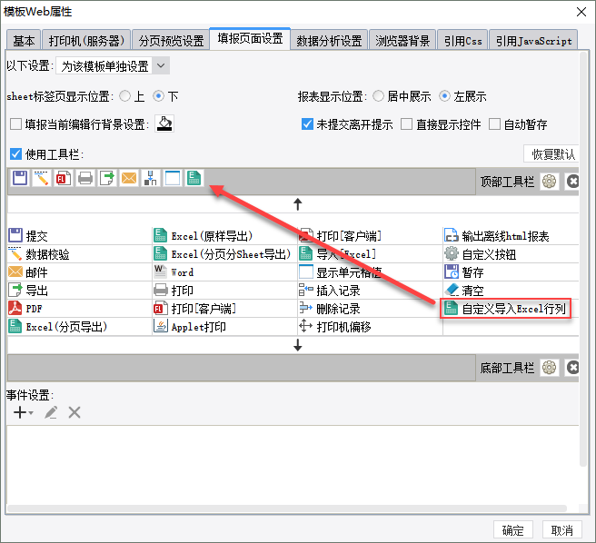 选择模板>模板web属性>填报页面设置,双击添加自定义导入excel行列 至工具栏: