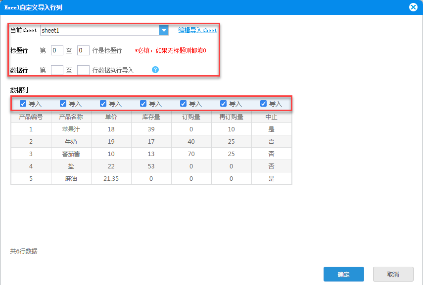 标题行1-2;数据行3-4:第1,2行为标题行,不导入;3,4行为数据行,执行导入