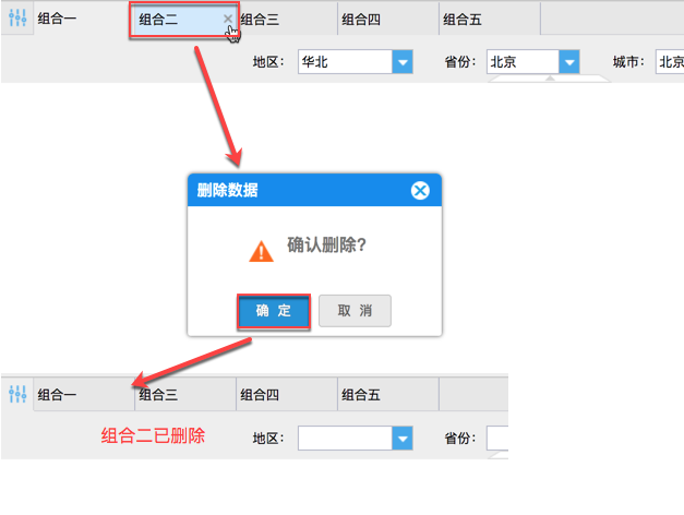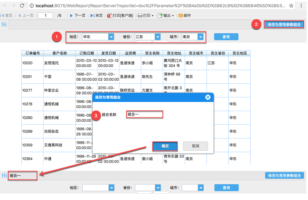 设置参数,地区:华东、省份:江苏、城市:南京,点击【保存为常用参数组合】,弹出对话框,输入“组合名称”,点击【确定】,这样一个参数组合就保存完成,如下图: