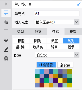 选中图表,在右侧点击样式,配色选择自定义,如下: