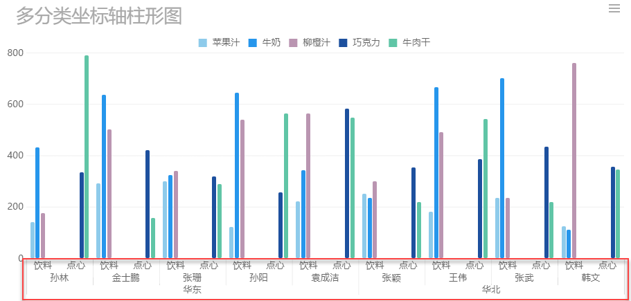 已完成模板可参考%FR_HOME%\WebReport\WEB-INF\reportlets\doc\Advanced\Chart\ColumnChart\多分类坐标轴柱形图.cpt。