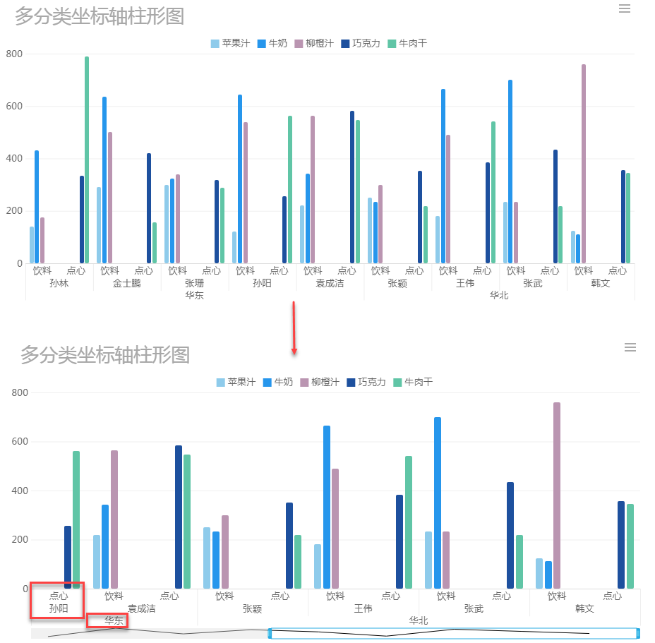 注:边界值根据分类值进行填写。该模板分类为三层:地区-姓名-产品,所以填写:["华东","孙阳","点心"]。