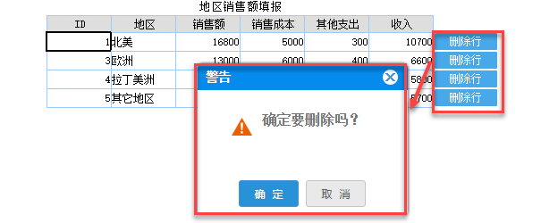 在实际操作中,Finereport默认的删除按钮,点击删除不进行提示,因此可能会出现误删的情况,这样的操作用户体验感比较差。所以很多时候删除行操作需要二次确认再进行删除操作,如下图所示的效果,即点击删除时,弹出确认删除的提示框。