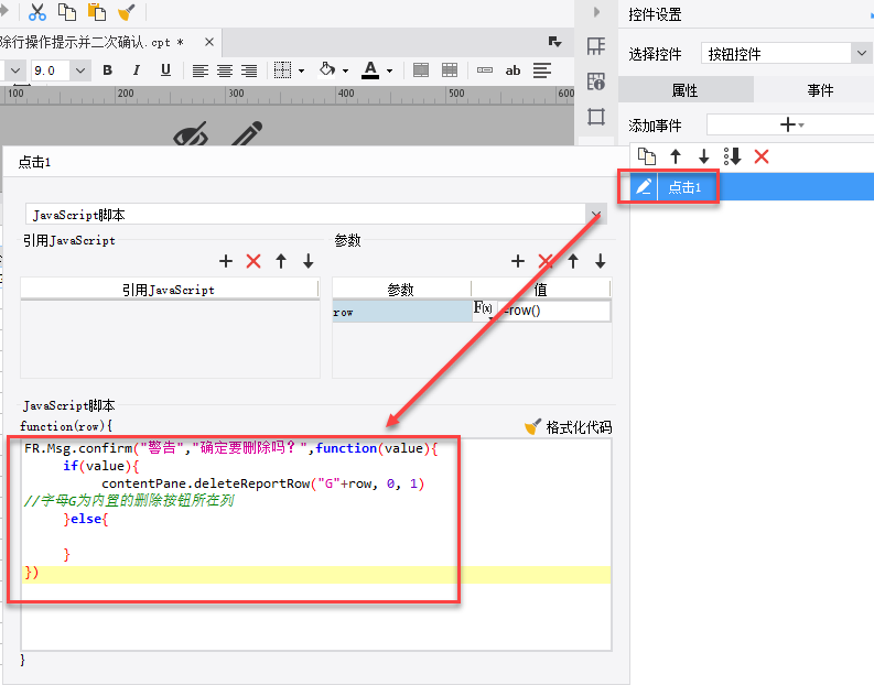 5)为普通按钮创建点击事件,传递参数row为公式row(),并添加js代码。