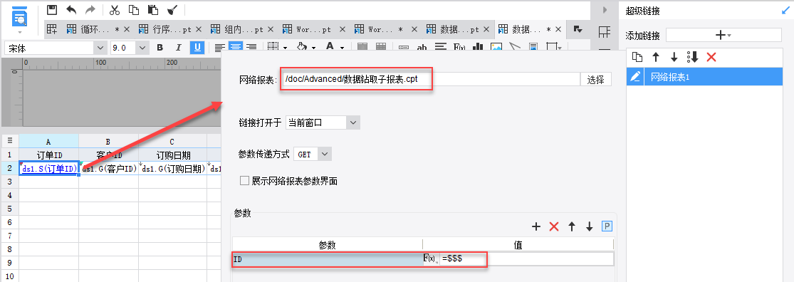 打开主表,右击订单ID数据列所在单元格,选择,右侧弹出超级链接属性面板,点击加号添加网络报表,然后按照下图设置超级链接: