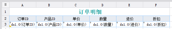 新建一个子表,数据集就是订单明细表,将表样设计如下样式: