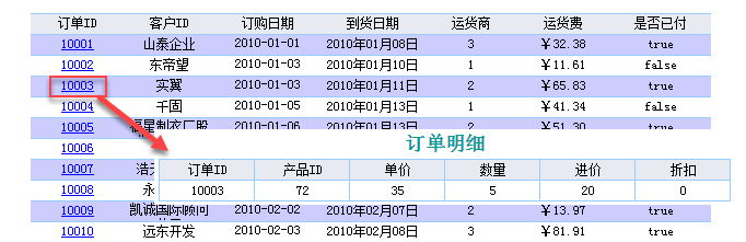 报表系统中数据的钻取是一个普遍的需求,如下图点击订单ID的时候能够钻取到该订单的明细数据。