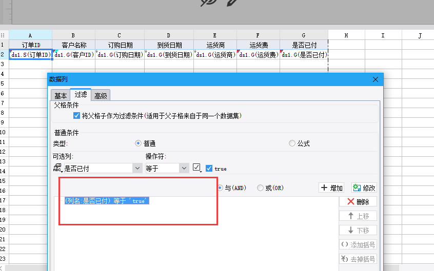选中“订单ID数据列”单元格,双击单元格,选择数据列的过滤标签,添加一条“是否已付”等于“true”,如下图所示: