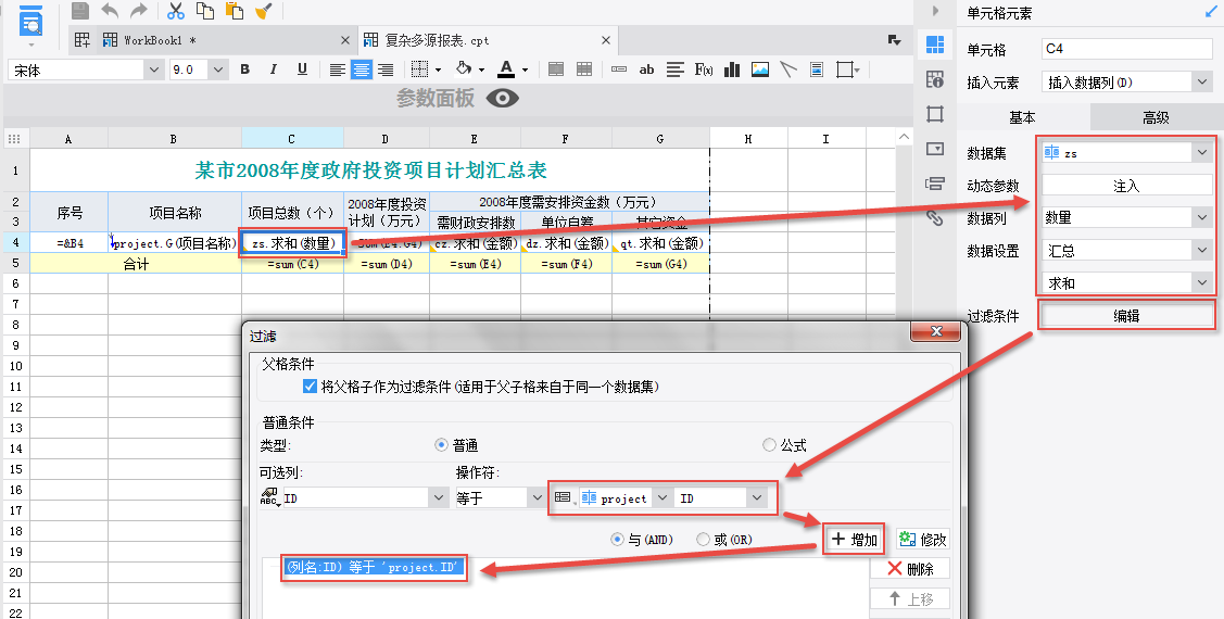 | C4 | zs | 数量 | 数据设置汇总求和,不扩展,过滤条件为“数据列”:ID等于project.ID,其它默认 |