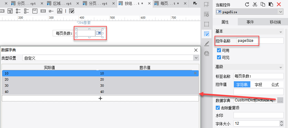 2)添加下拉框控件,控件名为pageSize,设置数据字典类型为自定义,如下图所示: