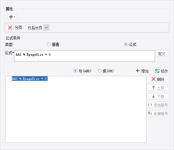 4)右击A5单元格,选择条件属性,右侧自动切换至条件属性设置面板,点击添加按钮,属性栏里面选择分页,下拉框里面选择行后分页,公式条件类型里面选择公式,公式为&A5 % $pageSize = 0,如下图所示: