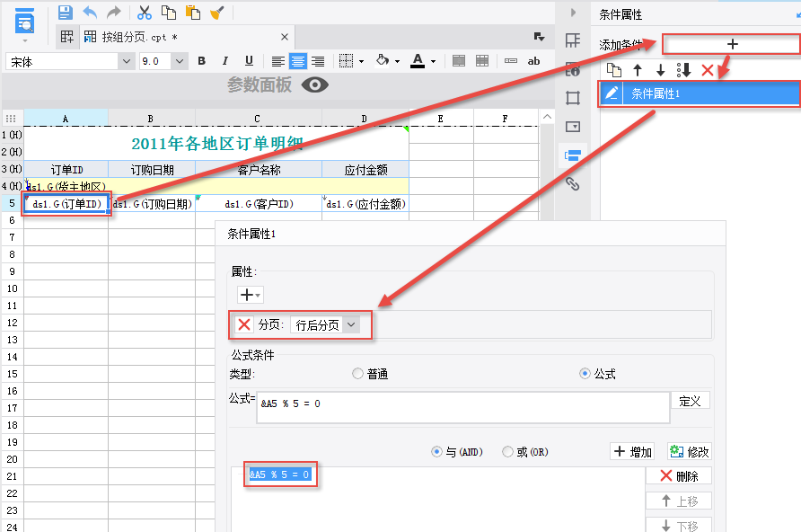 2)右侧自动切换至条件属性设置面板,点击添加按钮,属性栏里面选择分页,下拉框里面选择行后分页,公式条件类型里面选择公式,公式为:&A5 % 5 = 0如下图:2.3 保存与预览