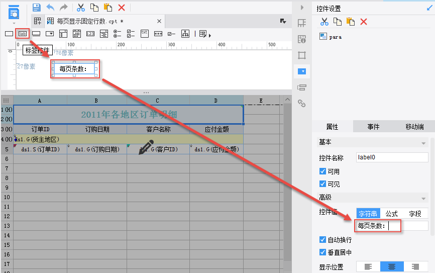 1)打开参数面板,添加标签控件,控件值设置为每页条数::