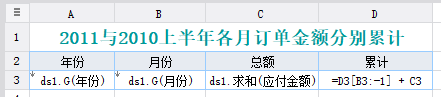 逐层累计就是在分组报表中,每一组中分别将每层与上一层数据相加,得到这一层的累计结果,如下图所示的年度累计:
