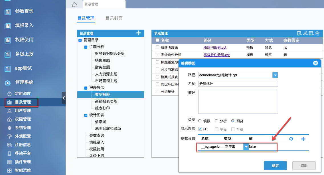 如果用户是从决策系统中打开模板,即http://localhost:8075/WebReport/ReportServer?op=fs中访问时,管理员可以在管理系统>目录管理>节点管理中添加需要访问的模板,新增参数,名称设置为__bypagesize__,类型设置为字符串,值为false,如下图所示:
