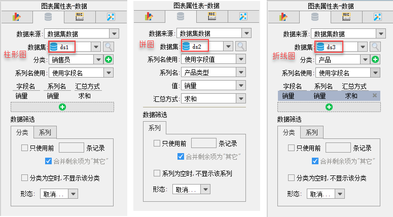 新建3张图表,柱形图、饼图、折线图,其数据源分别为ds1,ds2和ds3,具体数据源设置如下图: