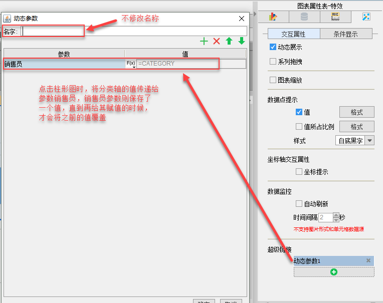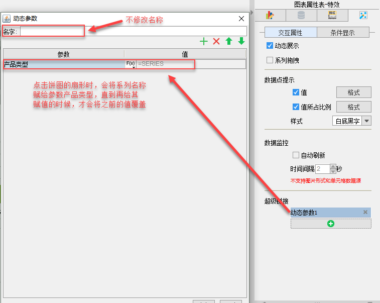 点击柱形图时,需要将柱形图的分类轴传递给饼图,作为饼图数据源和折线图数据源的一个参数值,点击饼图时,需要将饼图的系列名传递给折线图作为折线图数据源的参数值,如果类似图表联动中的是两个图表之间的相互关联,则直接使用超级链接-联动单元格,但是此处折线图需要接收来自柱形图的分类轴值,而折线图却不是和柱形图联动,所以无法直接使用 ,我们可以使用超级链接中的 ,点击柱形图或饼图的时候,动态的给参数赋值,并且参数值一直存在,设置如下图: