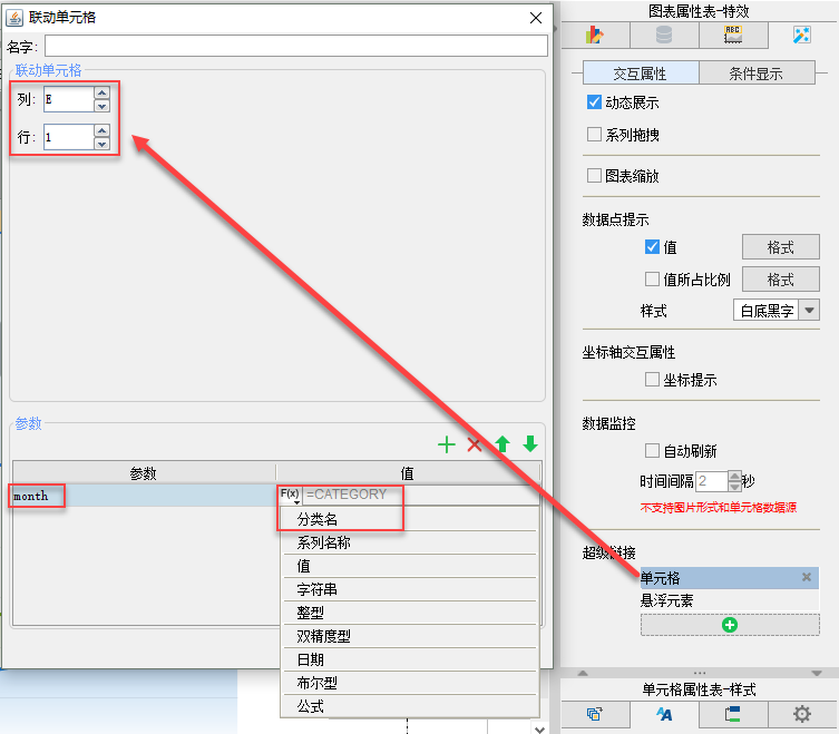 添加单元格联动图表选中主图表,选择图表属性设置-特效>交互属性,点击超级链接,添加一个图表超链-联动单元格,选择图表所在单元格,并传递参数month,参数值选择分类名: